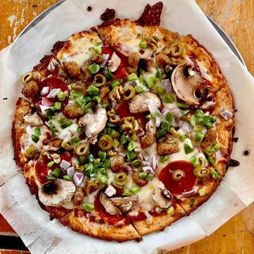 Marinara, Sausage, Pepperoni, Mushrooms, Green Olives, Red Onion, Green Peppers, and Mozzarella